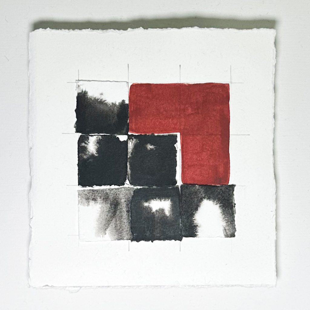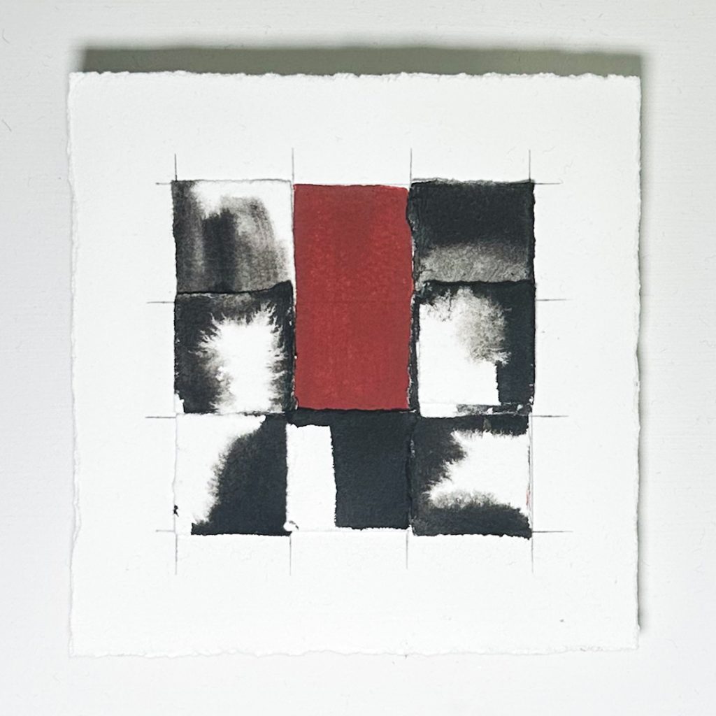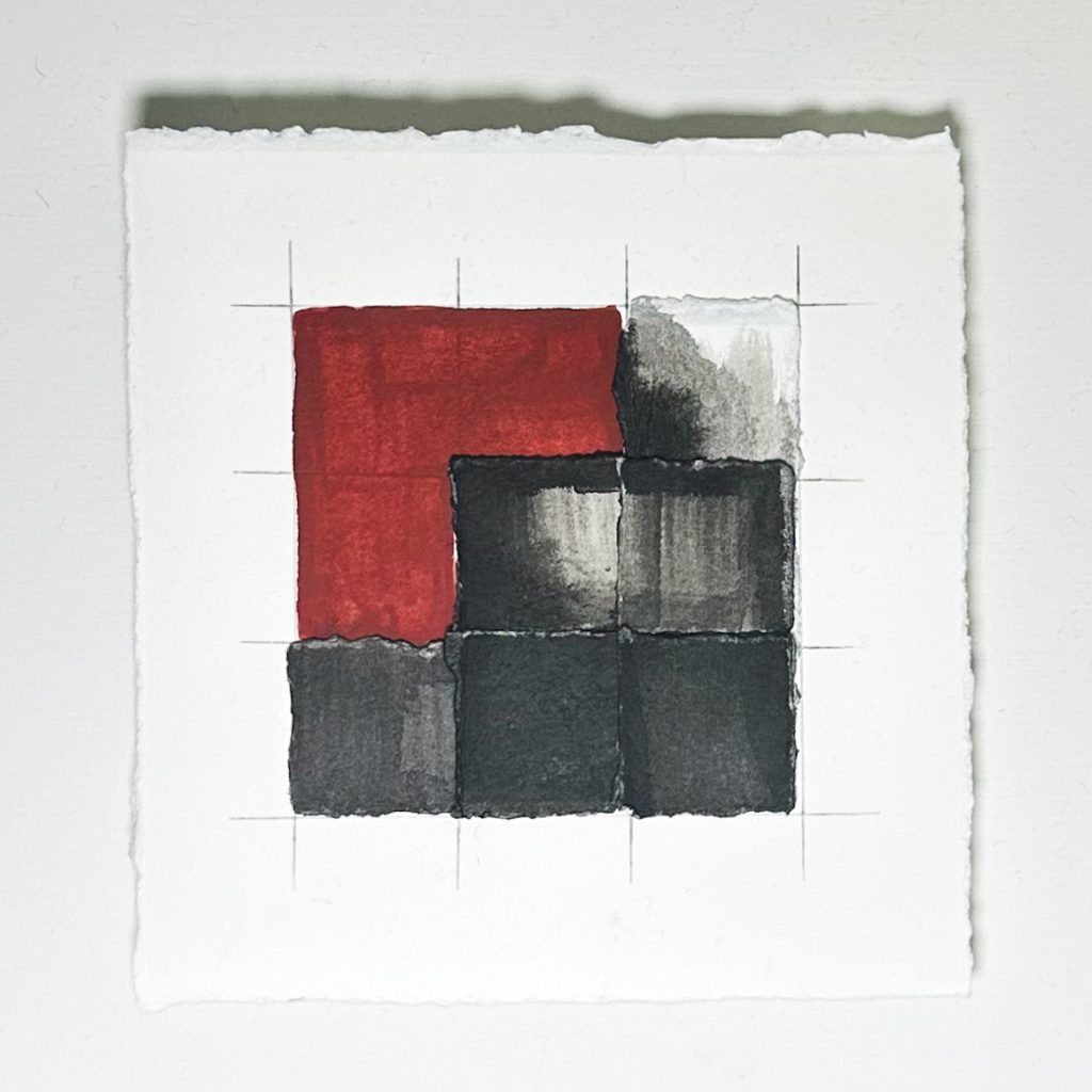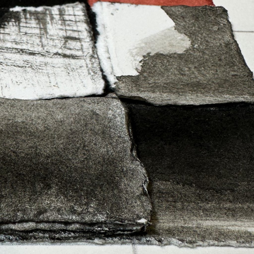 Ink and clay bole on Somerset Satin paper. A series of work stacking layers of torn paper in grid formations. The arrangements take their reference from the Cube Charred sculptures.